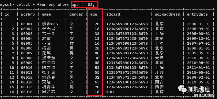 select * from emp where age != 88;