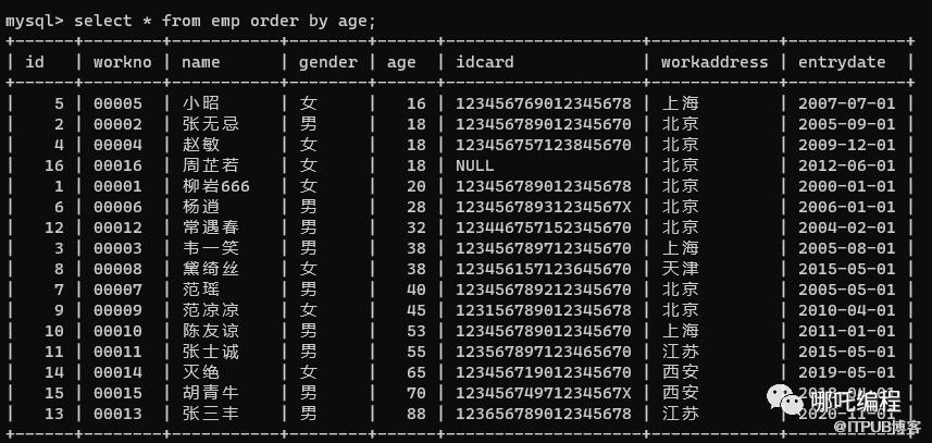 select * from emp order by age asc;