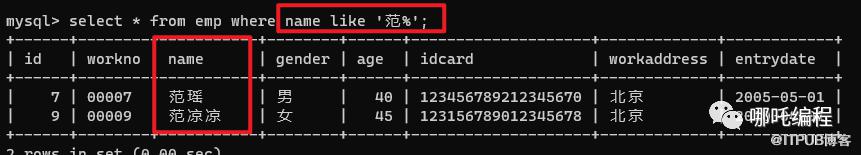 select * from emp where name like '范%'; # 名字可以为范X,范XX,范XXX等等