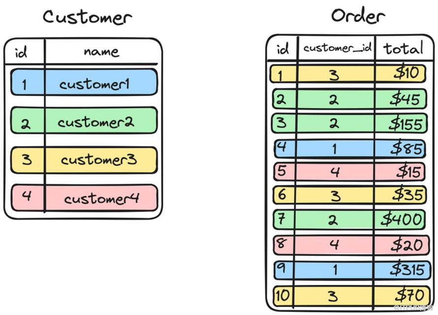 该应用程序包括两个关键表格,跟踪 Customers(客户)和他们的 Orders(订单)(注意,颜色用于区分来自不同客户的订单)。