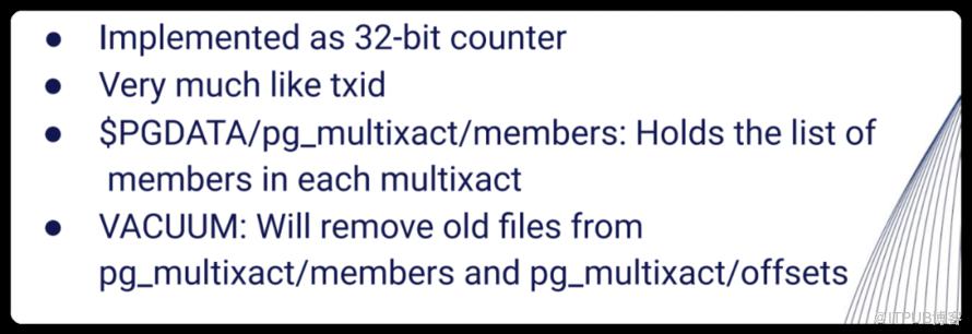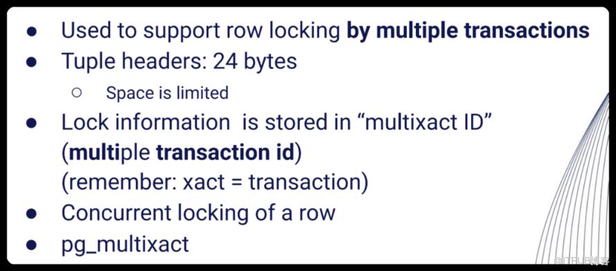 Used to support row locking by multiple transactions,之前我也写文章详细讲过其原理 深度剖析 MultiXactID,将一组事务 ID 记录到一个 MultiXactID 中,进行映射。