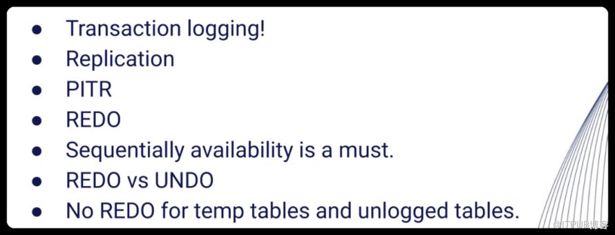 Write Ahead Log,各位应该十分熟悉了,预写日志,用在 PITR/复制/备份恢复等等,对于 unlogged table 和 temp table,不会记录 REDO