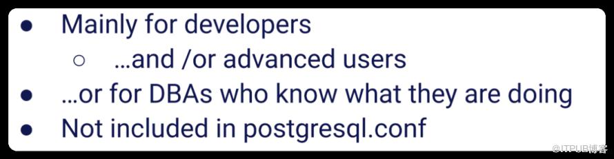 作者还提及了许多隐藏参数,默认情况下,postgresql.conf 文件中不包含,主要给开发者使用。