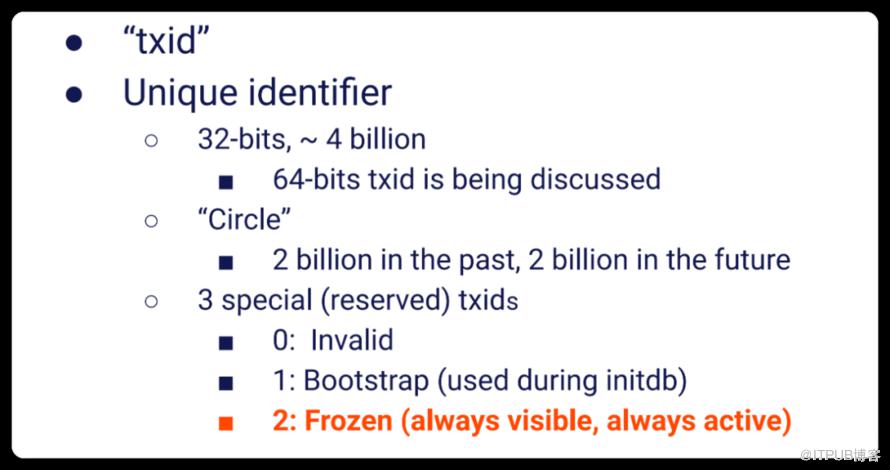 txid:"Transaction ID",表示事务 ID,其上限是 32 位无符号整型。对于写入操作,PostgreSQL会分配永久性的事务 ID,而对于只读事务,只会分配虚拟事务 ID,用于节省事务 ID 的资源