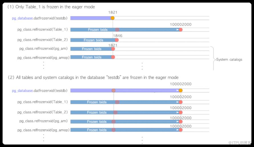 All transaction IDs before this one have been replaced with a permanent transaction ID in this database,表示该数据库中最老的已冻结的事务 ID,是 pg_class.relfrozenxid 中的最小值。