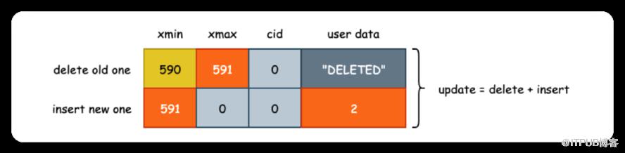 xmin 和 xmax 分别代表插入某一行的事务 ID、删除或更新某一行的事务 ID
