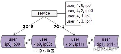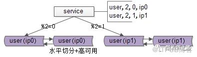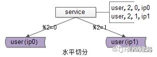 如上图所示,用户库user分布在两个实例上,ip0和ip1,服务层通过用户标识uid取模的方式进行寻库路由,模2余0的访问ip0上的user库,模2余1的访问ip1上的user库。