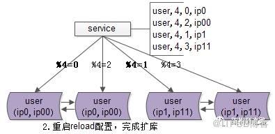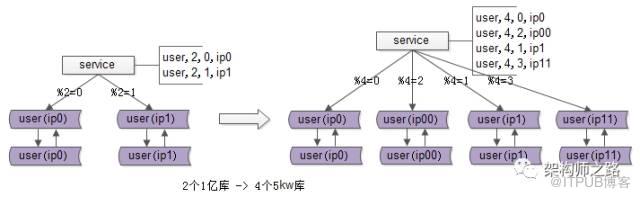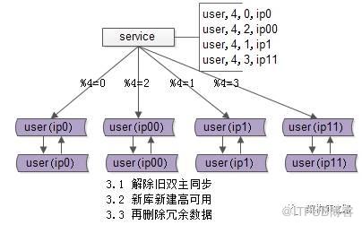 新的问题来了,分成n个库后,随着数据量的增加,要增加到2*n个库,数据库如何扩容,数据能否平滑迁移,能够持续对外提供服务,保证服务的可用性?