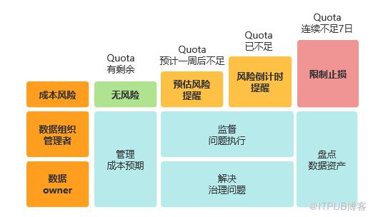 QUOTA限制,是公司数据委员会上发布过的重磅管控策略之一。它起于存储QUOTA,规定了业务部门的存储用量达到该部门存储QUOTA后,将触发大数据资源使用限制,直至用量恢复到QUOTA以下。