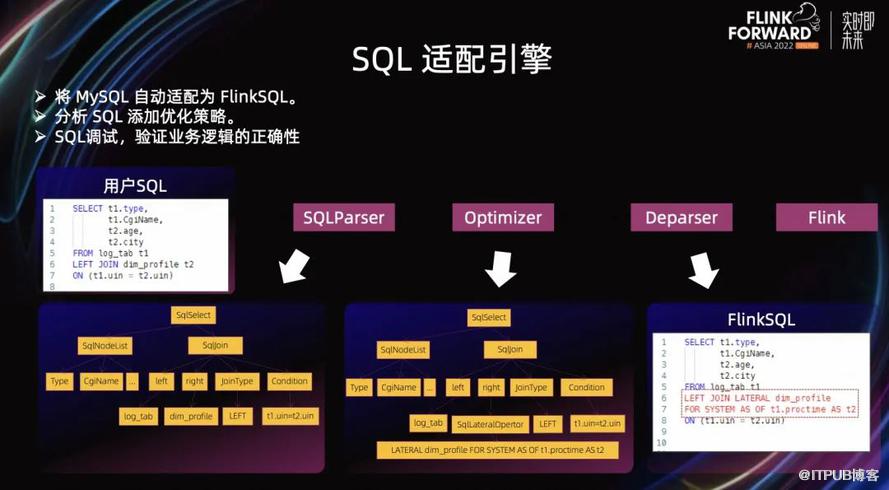 我们看下上图中的例子。如果用户要写一个维表关联,就是 Lookup 计算,那么他只需要按 MySQL 语法写维表关联就行了,即一个 Join 语句。之后我们分析用户的 SQL,哪个是流式表,哪个是为表,然后把 SQL 解析之后再转换成 Flink SQL 到 Flink 里执行。这样用户不需要学习 Flink SQL,门槛会更低。