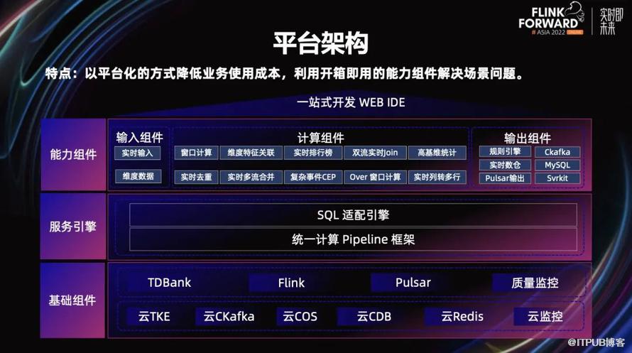 首先我们拥有一站式的 WEB IDE,安全策略人员只需要在我们的 WEB IDE 上就能开发它的特征。同时,我们提供了很多能力组件,比如输入组件有实时输入、维表输入等等。计算组件有窗口计算、维表关联、排行榜、双流 Join、去重等等。通过输出组件可以快速对接到它们的服务里,比如对接到规则引擎、KV 的实时数仓、消息队列、Svrkit(RPC 的一个服务)。