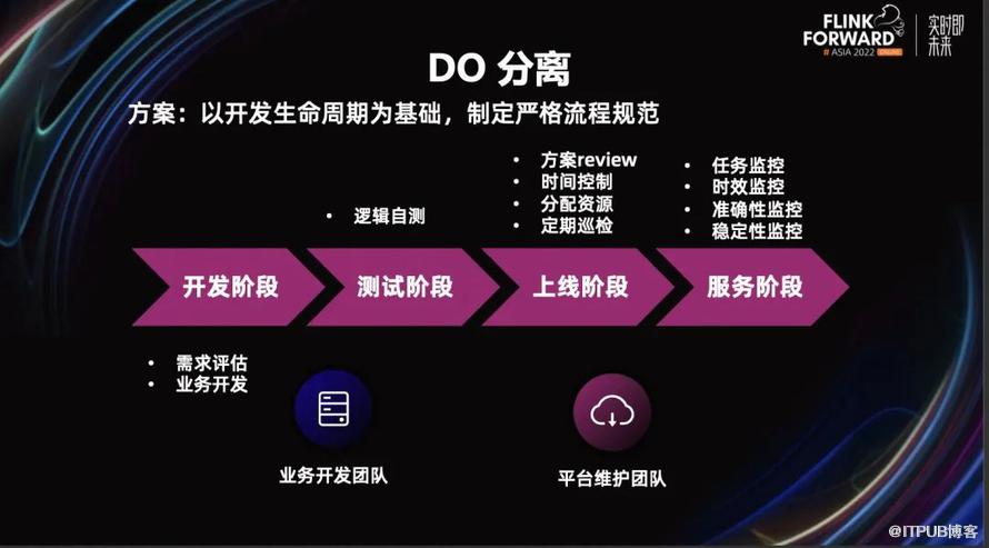 为什么这么做呢?因为我们的业务团队对 Flink 不熟悉,对 Flink 很多运营指标也不能很好的把控,比如 Watermark 的延迟监控、内存指标监控等等。而 Flink 团队他对 Flink 很熟悉,可以快速判断系统的瓶颈在哪里,优化调整资源等等。所以我们做了这样的职责分离,更好的保障我们服务的稳定性。