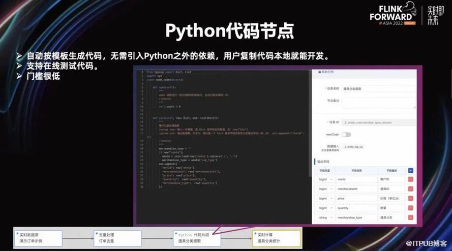 用户只需要拖拽 Python 代码片段节点,我们就能生成一个框架代码,且我们生成的框架代码没有引入除 Python 基础库以外的任何依赖,用户只需实现函数里的内容即可。这个函数有一个输入是 Dict,返回是 List。用户甚至也可以把代码复制到本地进行调试,也支持在线测试代码。配置完节点后,只要指定输出字段以及字段类型即可。然后注册 Schema,这个门槛很低。这个代码片段可以简单理解成 Flatmap 的过程。