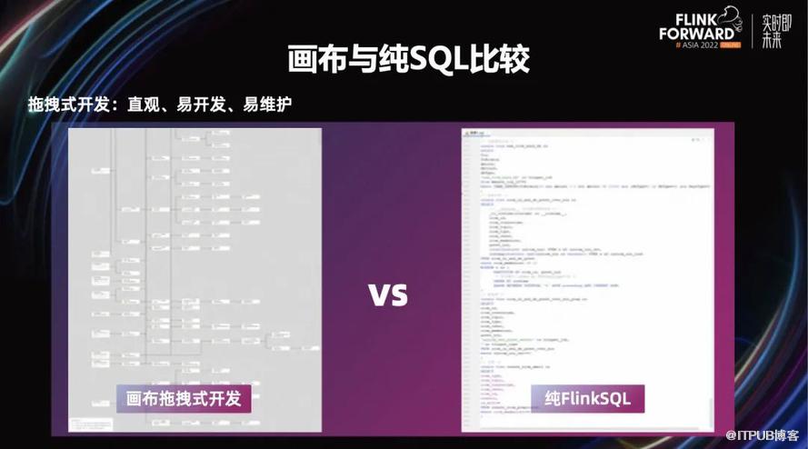 接下来,看一下画布与纯 SQL 比较。我们在使用的时候,觉得拖拽式开发更加直观、易开发、易维护。