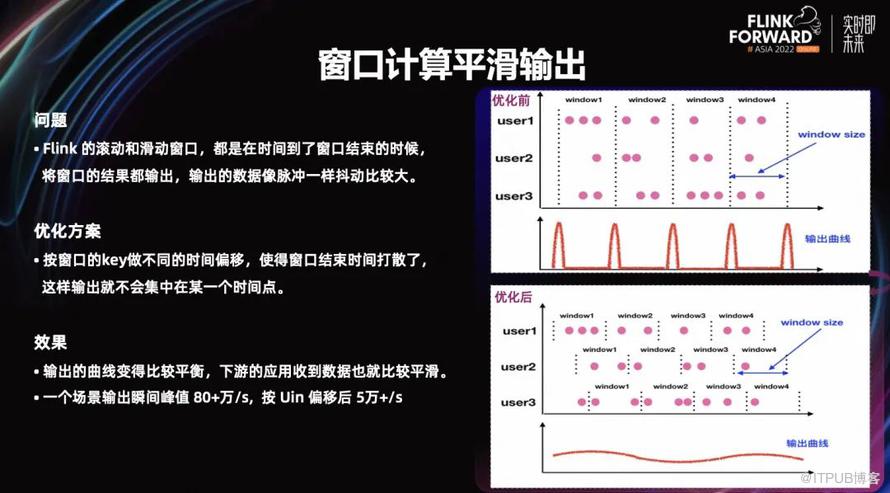 Flink 的滚动和滑动窗口,都是在时间到了窗口结束的时候,将窗口内的所有结果统计并在一瞬间输出。比如窗口统计的 key 值达到几百万、上千万,他要瞬间把几百万、上千万的数据输出的话,输出到下游是 RPC 的服务或者是 KV 的存储。这样一瞬间产生大量的写入量写入到下游,就会对下游的系统稳定性造成一定的冲击。