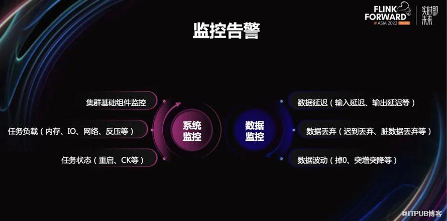 系统监控,它由我们的数据平台技术团队提供。它支持集群基础组件监控和负载监控,比如内存、IO、网络等等;支持任务状态,比如重启、CK 等等。 数据监控,数据还是要通过数据监控来才能更好的把握。比如数据延迟,输入延迟是多少,输出延迟是多少等等;数据丢弃,迟到丢弃多少,脏数据丢弃多少等等;数据波动,突增突降,突然掉 0 等等。