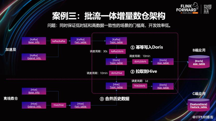 业务的需求是,既要支持对数据延迟比较敏感并且数据一致性要求较高的 BI 场景,也要支持依赖较长历史周期数据算法的训练场景。为了保证高时效性,并且不能有太多的重复数据。业务将实时数仓的 Kafka 数据,灌入到 Doris 中,利用 Doris 的主键模型去重。再按 10min 的调度周期,支持较高时效性要求的BI报表查询场景。另外对于一些算法场景,不但需要长时间周期的特征数据,还需定期与 Hive 上的历史数据做合并。链路很复杂,会带来大量不必要的运维工作。与此同时,链路上多处依赖调度系统,这会给就绪时间,带来很多不确定性,更不用提数据一致性的保证。