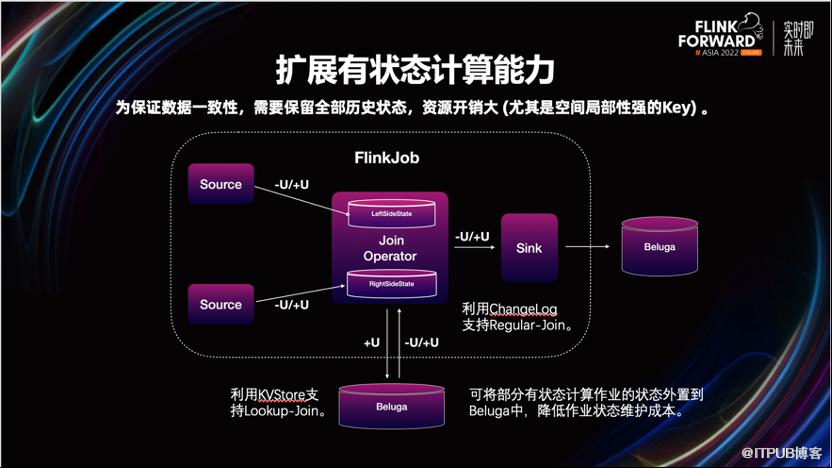从左图中我们可以看到,我们将 UPDATE 事件的 UPDATE_BEFORE 与 UPDATE_AFTER 事件合并到一条记录中,类似 MySQL 的 Binlog。这样可以保证更好的原子性,消除了数据不一致的风险。并且一定程度的使数据更紧凑,一定程度的减少序列化的开销。而且我们也了解到 Hudi 在 0.13 后也会采用类似的设计。2.4 扩展有状态计算场景