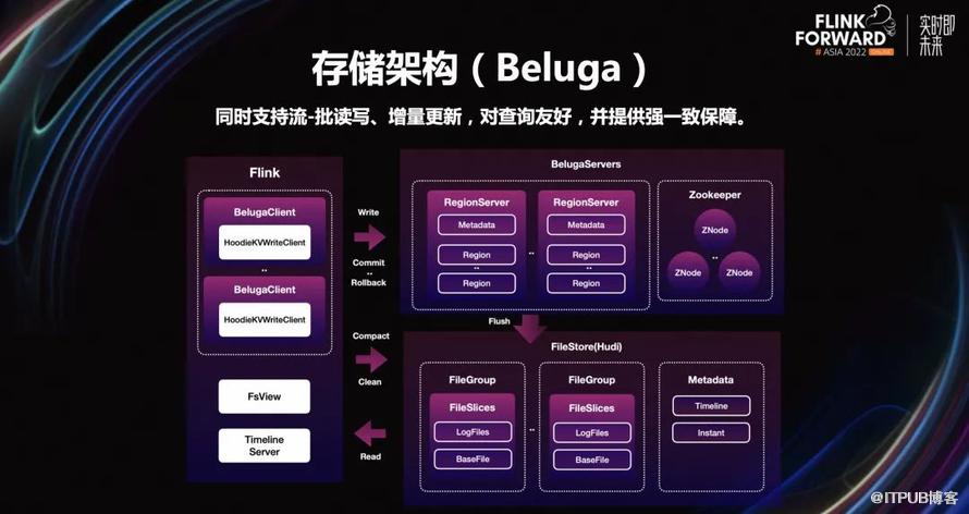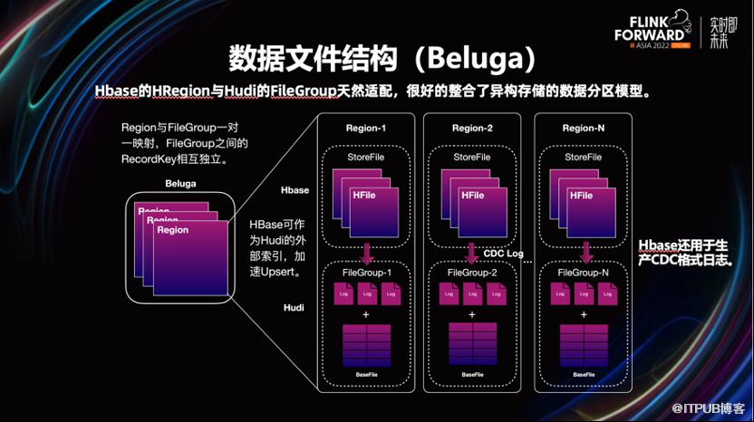 实现增量计算、更新,引入了一套支持事务管理、主键和 CDC 能力,可同时按部分行和列进行更新,并且对查询友好的新的存储引擎。这个新存储引擎的名字我们内部叫做 Beluga,它的基本架构是在 Hudi 的基础上,加以改造而来。改造 Hudi 的动机是,最初 v0.8 不支持 CDC。考虑到了这点,我们引入 Hbase(KV)来生产 Changelog。