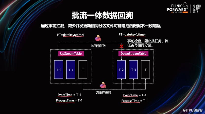 要解决这个问题,会让业务先停掉流计算任务,再用批任务进行数据覆盖更新。完成批覆盖写之后,再重新启动流任务,回补断流期间的数据。在一些无写冲突的情况下,可以不停掉流计算任务。等到批任务完成数据更新后,再结合实际情况,选择通过流任务来回放批未覆盖到的分区数据。这样可以一定程度的减少断流时长,加快了数据回溯的过程。为了避免用户误操作,我们在工具链层面,对可能有并发写冲突风险的作业,进行事前拦截。