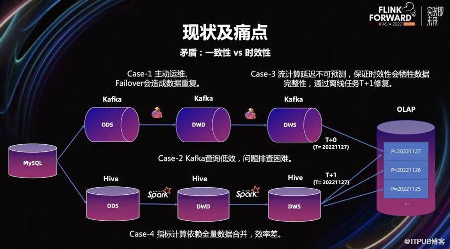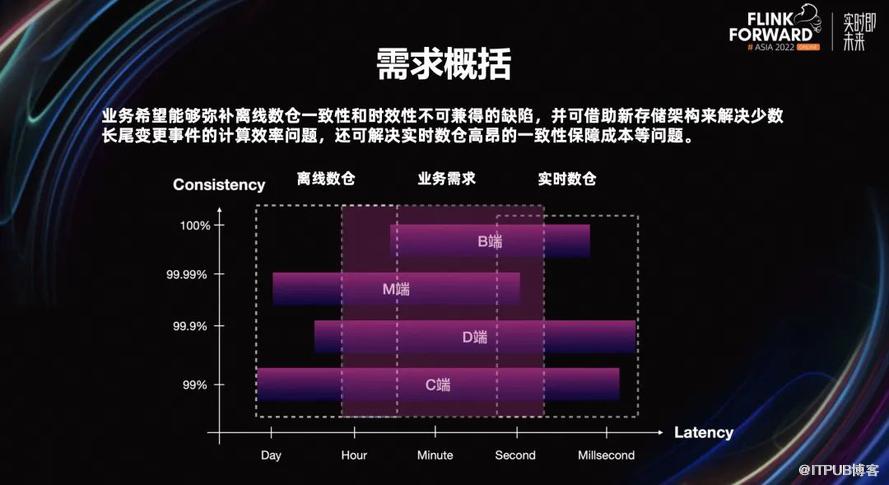 比如对高数据新鲜度的场景,高度依赖 Kafka,而其最初的架构设计就没有充分考虑到对数据一致性的保证。业务会通过排序、幂等处理等手段牺牲计算资源,达成了数据一致性。此外还有的问题是,运维门槛高。一个的典型的案例是,美团某 B 端业务场景对数据新鲜度要求较高,其交易主题表要求在 Flink 作业中保留 180 天状态数据,单任务状态大小>50TB,改口径后的直接消费上游 MQ 回溯数据,时长会超过 1 天,业务方很难接受,目前只能被动改造成先刷离线不变数据,再刷增量变更数据。对时延不敏感,但需要能够灵活的将数据按不同粒度进行组织访问的离线场景,重度依赖于 Hive,而其的最初也并未考虑到数据高效的更新的能力。典型的例子是,离线数仓最新快照事实表的生产场景,这种类型数据在业务上很常见,要求将上游的按天、小时生产的 DeltaRecord 与下游表中的存量数据快照做 Merge,理论上只需从存量快照数据中按 DeltaRecord 的 key 取出全部变更记录,Merge 之后再覆盖写即可。但当前离线数仓的普遍做法是全量加载存量快照数据,再与增量数据做归并排序后取最新一条,未变更记录的加载是非必要且浪费资源的。