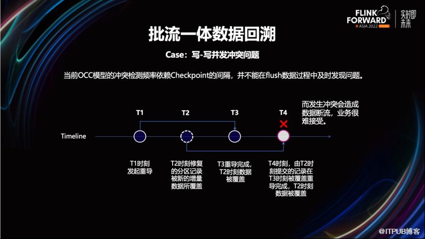 我们发现,公司一些业务的业务数据的状态流转周期不固定。如一张事实表,按照事件时间进行分区后,它最近几个物理分区内的数据都有可能被流任务更新。如果此时不加限制的使用批任务,就可能会覆盖更新鲜的数据,影响最终计算结果。属于典型的写到写的并发冲突。