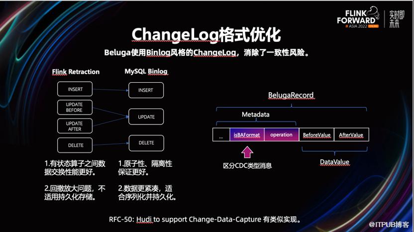 为了解决这些问题,Beluga 设计了一套固定分桶策略。通过这套新分桶策略,我们在数据写入前就确定了其所属的分桶,而不是随着时间的变化,动态的增加分桶,这样有效控制了文件数的增长。并且由于引入了 Hbase,对于数据更新操作,可以减少通过 HDFS 拉取文件构造元数据和索引的频率,进一步提升读写性能。面对数据倾斜问题,我们加入了一套均衡算法,最大程度上保证分桶间的数据量保持均衡。2.3 CDC 数据格式优化