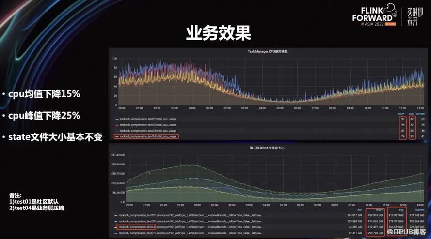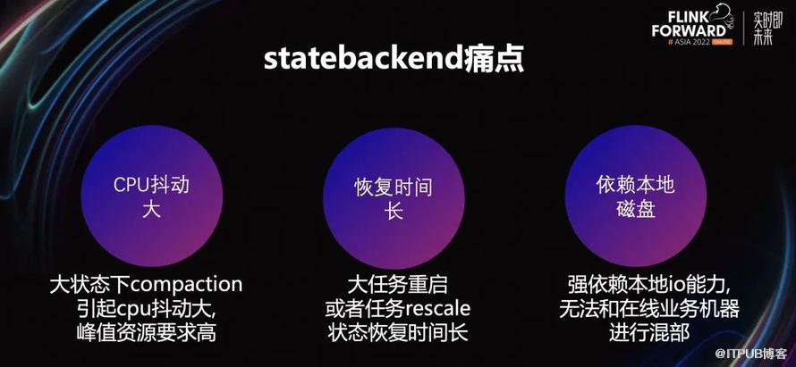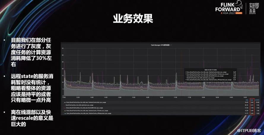 cpu 抖动大。rocksdb 的原理决定了它一定会有一个 compaction 的操作。目前,在小状态下这种操作对任务本身没什么影响,但是在大状态下,尤其是超过 500GB 左右,compaction 会造成 cpu 抖动大,峰值资源要求高。尤其是在 5、10、15 分钟这种 checkpoint 的整数被间隔的情况下,整个 cpu 的起伏会比较高。对于一个任务来说,它的峰值资源要求会比较高。如果我们的资源满足不了峰值资源的需求,任务就会触发一阵阵的堆积和消积的情况。