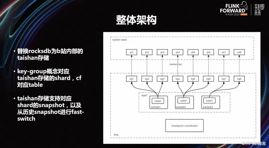 替换 rocksdb 为 B 站内部的 taishan 存储。Taishan 存储底层是分布式结构,Flink 的一些概念是可以对应到 taishan 存储上的。