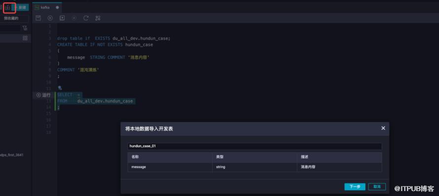 导入前,需要在datawork空间中新建测试表du_qa_dw_dev.hundun_case,用于导入演练数据