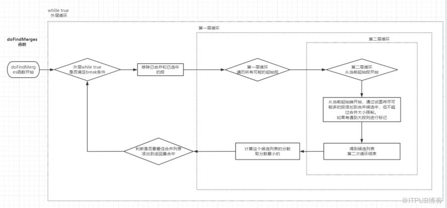 这个函数不断循环,每次选择一组最佳的合并段,构建合并规格,记录已选中的段,直到不能找到更多合并或不满足特定条件为止。这个过程中,函数将合并候选段进行组合,计算合并分数,并根据一定条件选择最佳合并。以下是关键的三个循环: