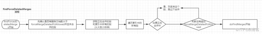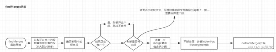 总的来说,就是为了得到可以合并的段列表、每次合并的最大段数、索引允许的段数、允许删除的文档数、是否有超出大的合并(合并的字节总数大于maxMergedSegmentBytes),而这些作为参数进而调用doFindMerges函数。