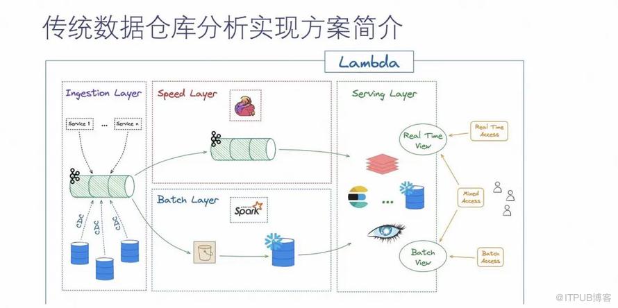 传统数据仓库分析的实现是一个典型 Lambda 架构,通过下图我们可以看出传统架构主要分为两层:上层是实时链路层,下层是离线链路层。它们的数据通过左侧的数据摄入层,通过不同路径将数据统一整合到像 Kafka 这样的消息队列中间件中,然后将数据分为两份相同的数据,分别由实时链路和批量链路进行处理,最终汇总到数据服务层,实现对用户提供数据分析服务的能力。