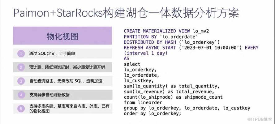 上图右侧 SQL 是描述如何建立一个 StarRocks 异步物化视图。它主要有以下几个特点: