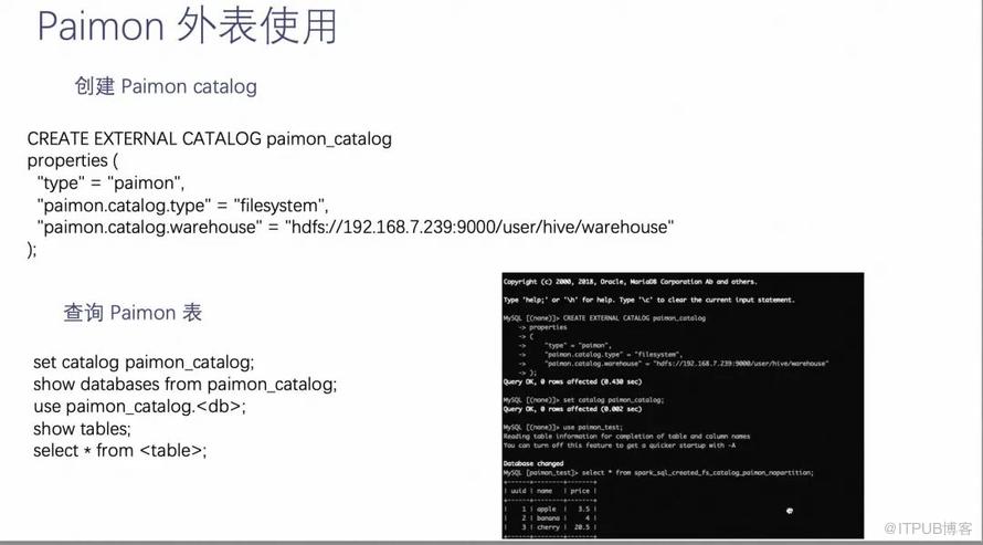 得益于 StarRocks 对外表 Catalog 的抽象,在 Paimon 推出不久,StarRocks 就以实现相应接口的方式,实现了对于 Paimon 外表的支持。在对接 Paimon 外表时,只需要在 StarRocks 上执行下面这条 Create External Catalog 语句,对 Type 指定为 Paimon,填写上对应的路径之后就可以直接查询 Paimon 中的数据了。