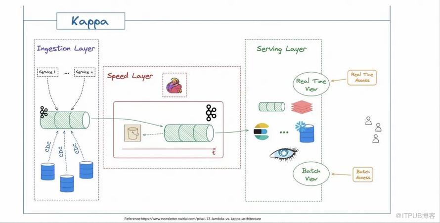Lambda 架构的出现主要是因为用户对于实时分析需求的出现,以及流处理技术的逐渐成熟。但是它也有一些明显的弊端,如上图所示,它需要维护两套系统,这就会导致部署成本和人力成本都会增加。当业务变更的时候,也需要修改两套系统来适应业务的变化。随着流处理技术的逐渐成熟,Lambda 架构之后又推出了 Kappa 架构,如下图所示。