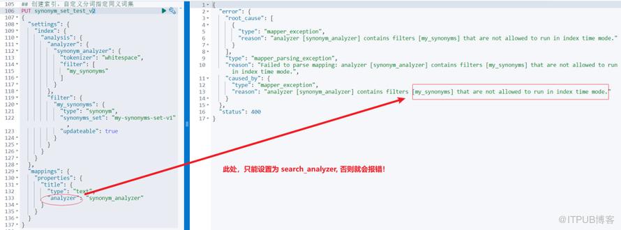 还有一个小贴士:如果你使用Elasticsearch的同义词 API 创建的同义词集,那么它们只能在搜索时使用(对应上面介绍的报错截图理解一下这里)。
