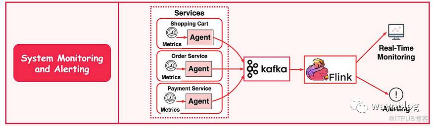 采集器(agent)读取购物车指标发送到 Kafka 中。 Flink 读取 Kafka 中的指标数据进行聚合处理。 实时监控系统和报警系统读取聚合数据作展示以及报警处理。