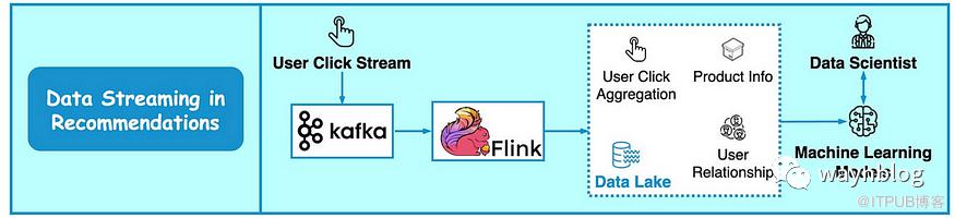 将用户的点击流数据发送到 Kafka 中。 Flink 读取 Kafka 中的流数据实时写入数据湖中其进行聚合处理。 机器学习使用来自数据湖的聚合数据进行训练,算法工程师也会对推荐模型进行调整。