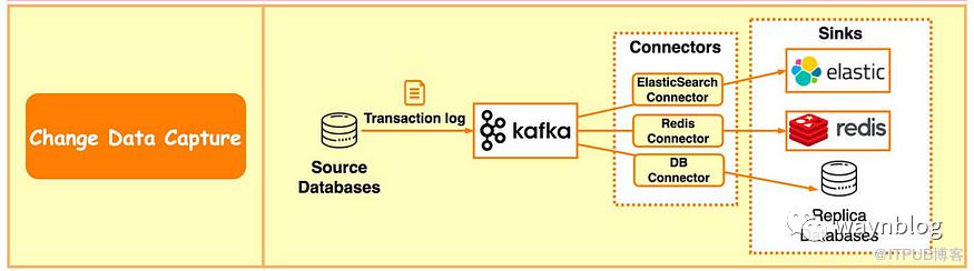 源数据源将事务日志发送到 Kafka。 Kafka 的连接器将事务日志写入目标数据源。 目标数据源包含 ElasticSearch、Redis、备份数据源等。