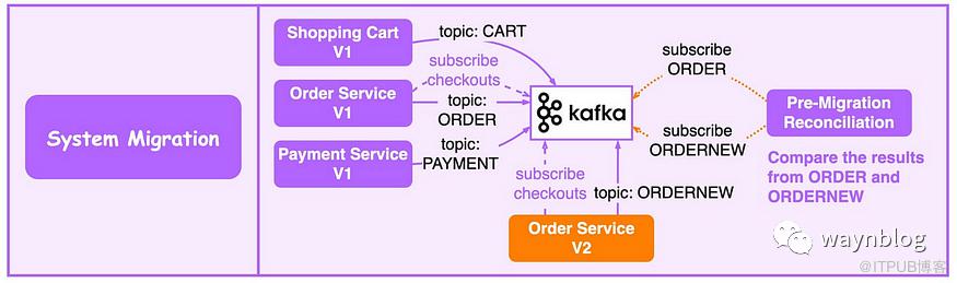 先将老的订单 V1 服务进行改造接入 Kafka,并将输出结果写入 ORDER 主题。 新的订单 V2 服务接入 Kafka 并将输出结果写入 ORDERNEW 主题。 对账服务订阅 ORDER 和 ORDERNEW 两个主题并进行比较。如果它们的输出结构相同,则新服务通过测试。