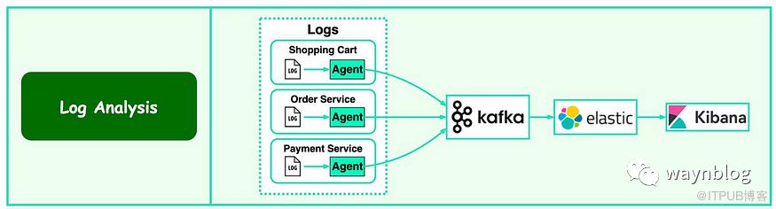 购物车服务将日志数据写在 log 文件中。 Logstash 读取日志文件发送到 Kafka 的日志主题中。 ElasticSearch 订阅日志主题,建立日志索引,保存日志数据。 开发者通过 Kibana 连接到 ElasticSeach 即可查询其日志索引内容。