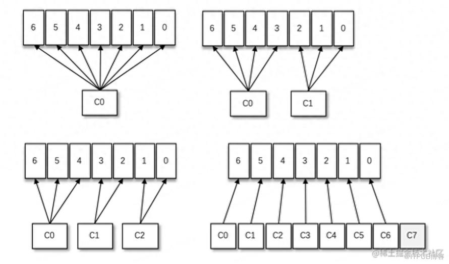 消费者与消费组这种模型可以让整体的消费能力具备横向伸缩性,我们可以增加(或减少) 消费者的个数来提高(或降低)整体的消费能力。对于分区数固定的情况,一味地增加消费者 并不会让消费能力一直得到提升,如果消费者过多,出现了消费者的个数大于分区个数的情况, 就会有消费者分配不到任何分区。参考下图(右下),一共有 8 个消费者,7 个分区,那么最后的消费 者 C7 由于分配不到任何分区而无法消费任何消息。