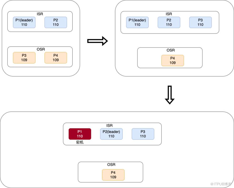 上图情况中,P1副本首先当选了leader,且只有P2副本同步了P1的数据,offset都为110,那么此时的ISR只有P1与P2,OSR有P3和P4。当P3同步数据到110后,也会被leader加入到ISR中,若此时leader宕机,则会从ISR中选出一个新的leader,并将P0踢出ISR中。
