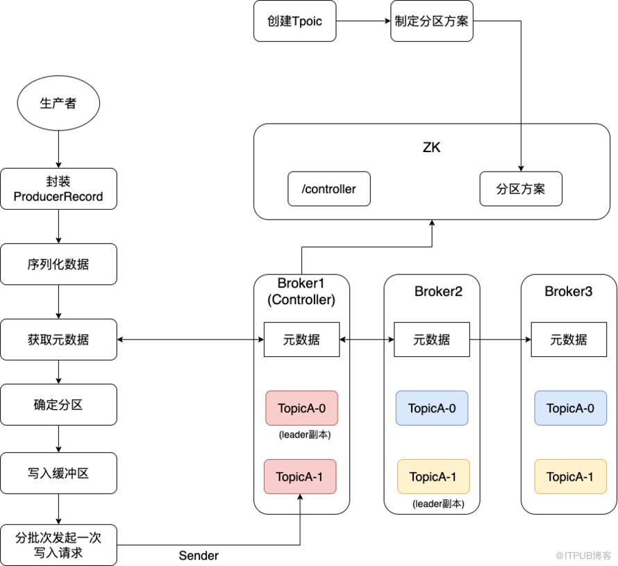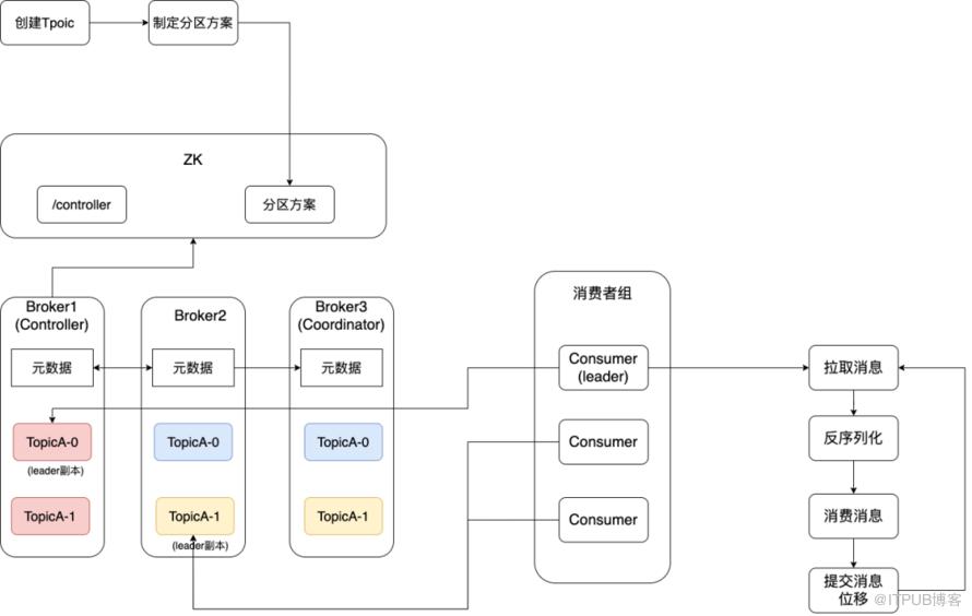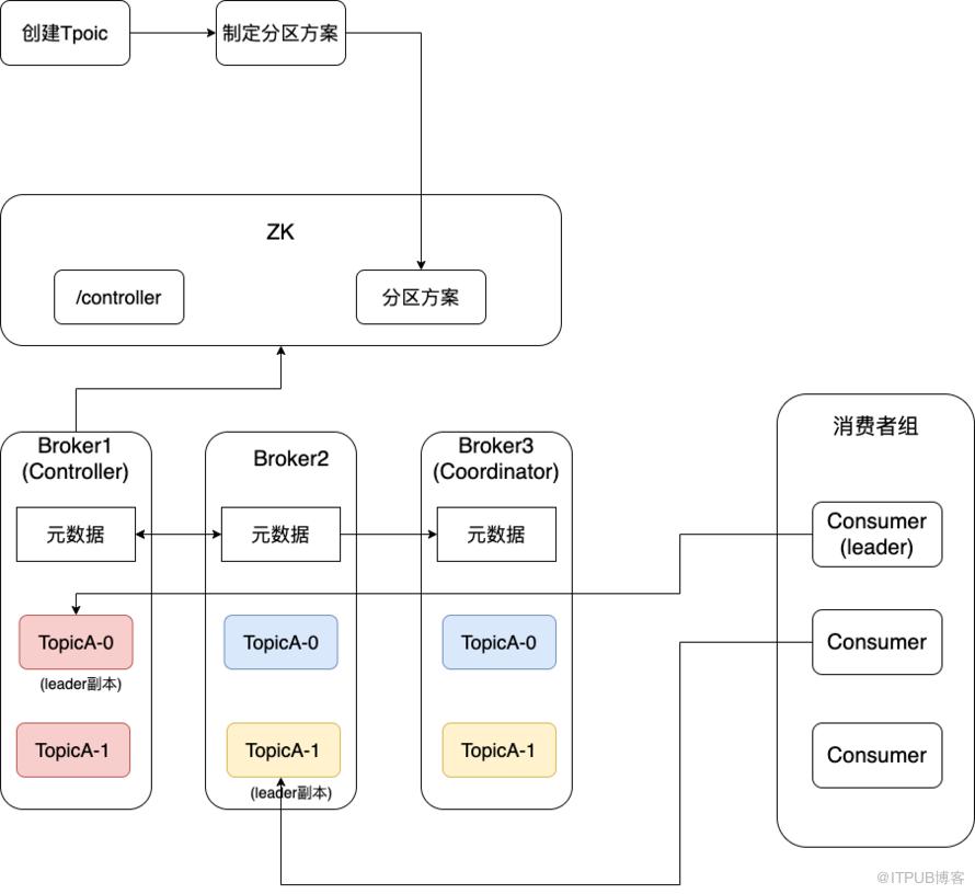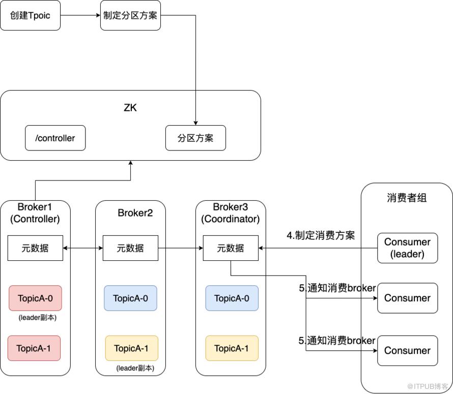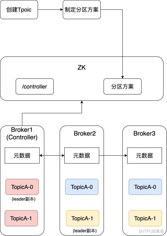 其中某个客户端接收到创建Topic请求后,会将请求中的分区方案(有几个分区、几个副本等)告诉ZK,ZK再将信息同步至Controller,此后所有的Broker与Controller交换完元数据,至此所有的Broker都已经知道该Topic的分区方案了,然后按照该分区方案创建自己的分区或副本即可。