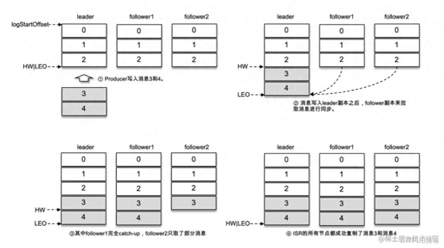 通过这种机制,leader副本就能知道哪些副本是满足ISR条件的(该副本LEO是否等于leader副本LEO)。