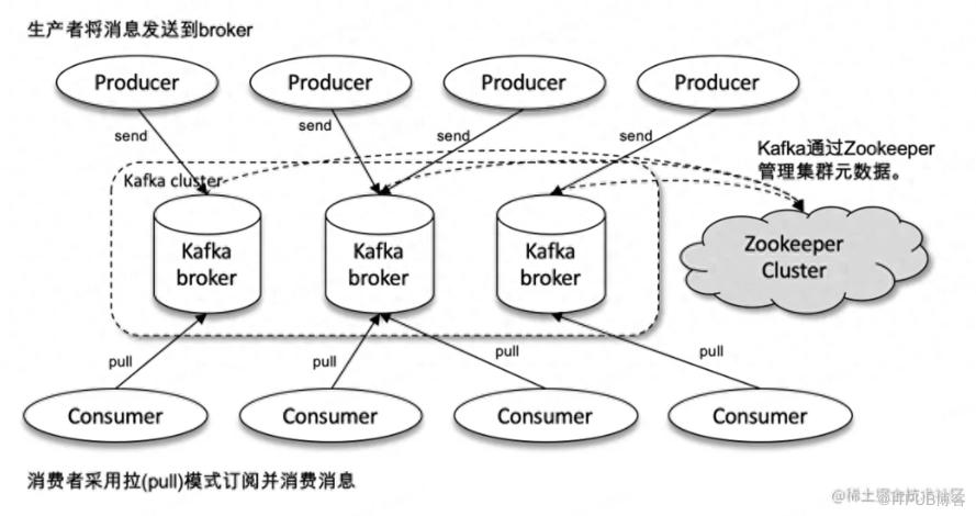 ZooKeeper 是 Kafka 用来负责集群元数据的管理、控制器 的选举等操作的。Producer 将消息发送到 Broker,Broker 负责将收到的消息存储到磁盘中,而 Consumer 负责从 Broker 订阅并消费消息。