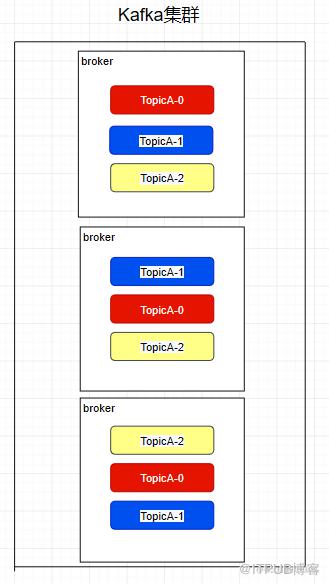 我们之前提到的Topic是逻辑概念即在于此,并没有物理存在,图中每个TopicA-x都是一个Partition,其中后面的数字代表了一个分区中的第几个副本,每个Broker中都有不同的副本,目的就是当有Broker宕机时,其他的副本还存在保证系统的可用性。