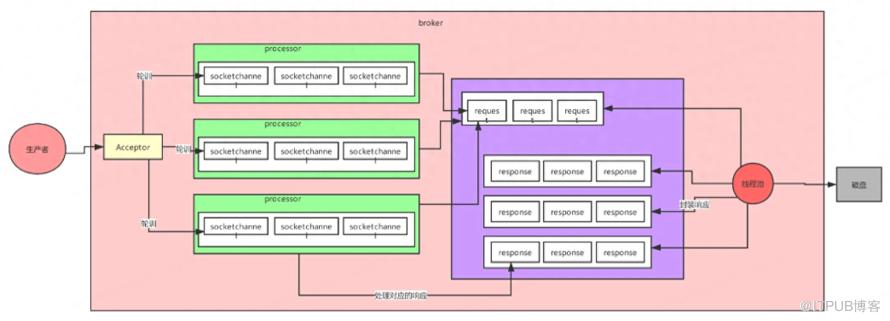 线程池里面默认有8个线程,这些线程是用来处理request的,解析请求,如果request是写请求,就写到磁盘里。读的话返回结果。processor会从response中读取响应数据,然后再返回给客户端。这就是Kafka的网络三层架构。
