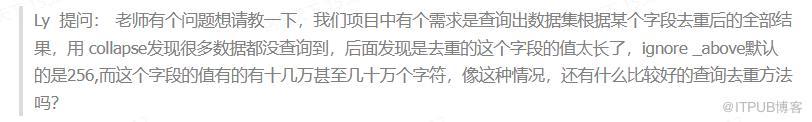 老师有个问题想请教一下,我们项目中有个需求是查询出数据集根据某个字段去重后的全部结果,用 collapse 发现很多数据都没查询到,后面发现是去重的这个字段的值太长了,ignore _above默认的是256,而这个字段的值有的有十几万甚至几十万个字符,像这种情况,还有什么比较好的查询去重方法吗?